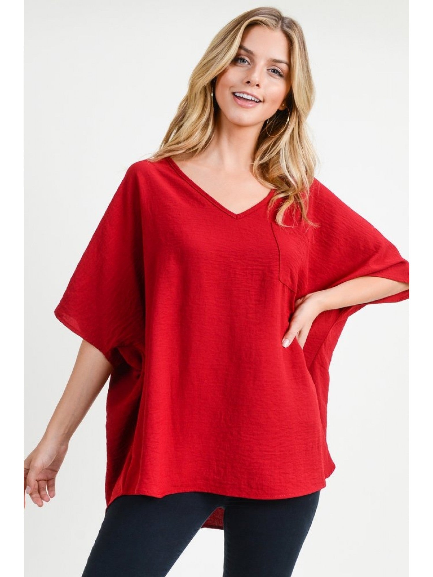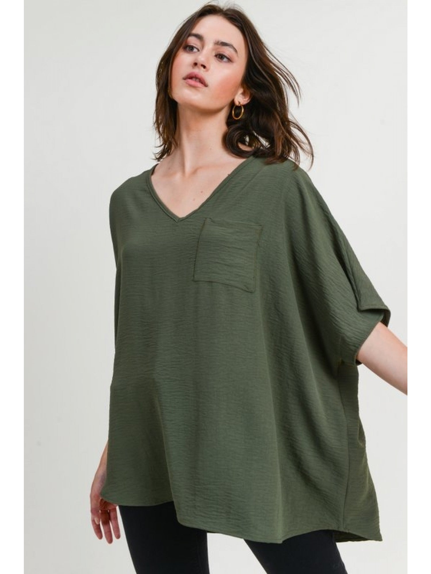 Solid top with wide V-neckline, dolman half sleeves, and a chest pocket.