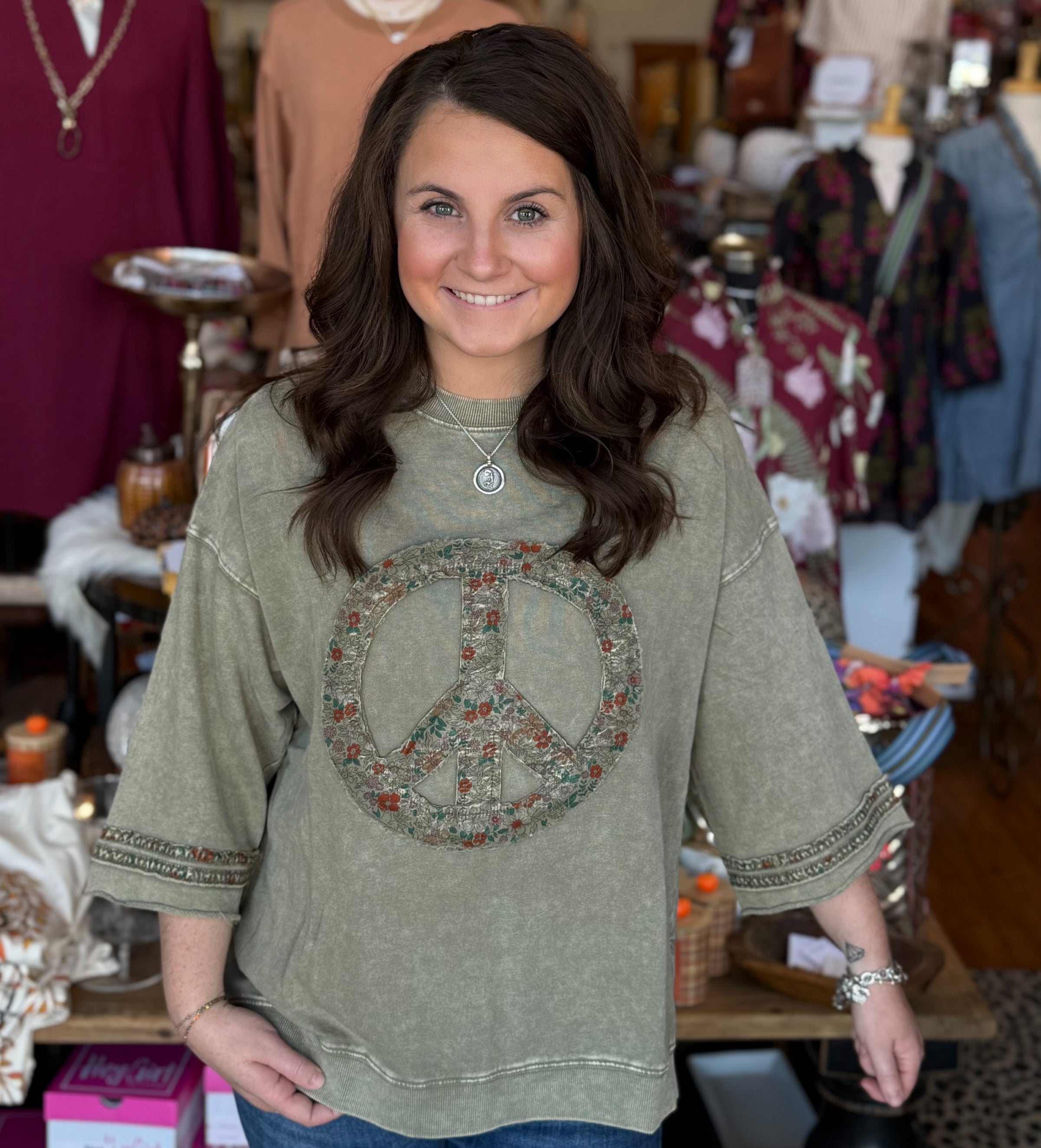 WASHED TERRY FLORAL PEACE SIGN PULLOVER