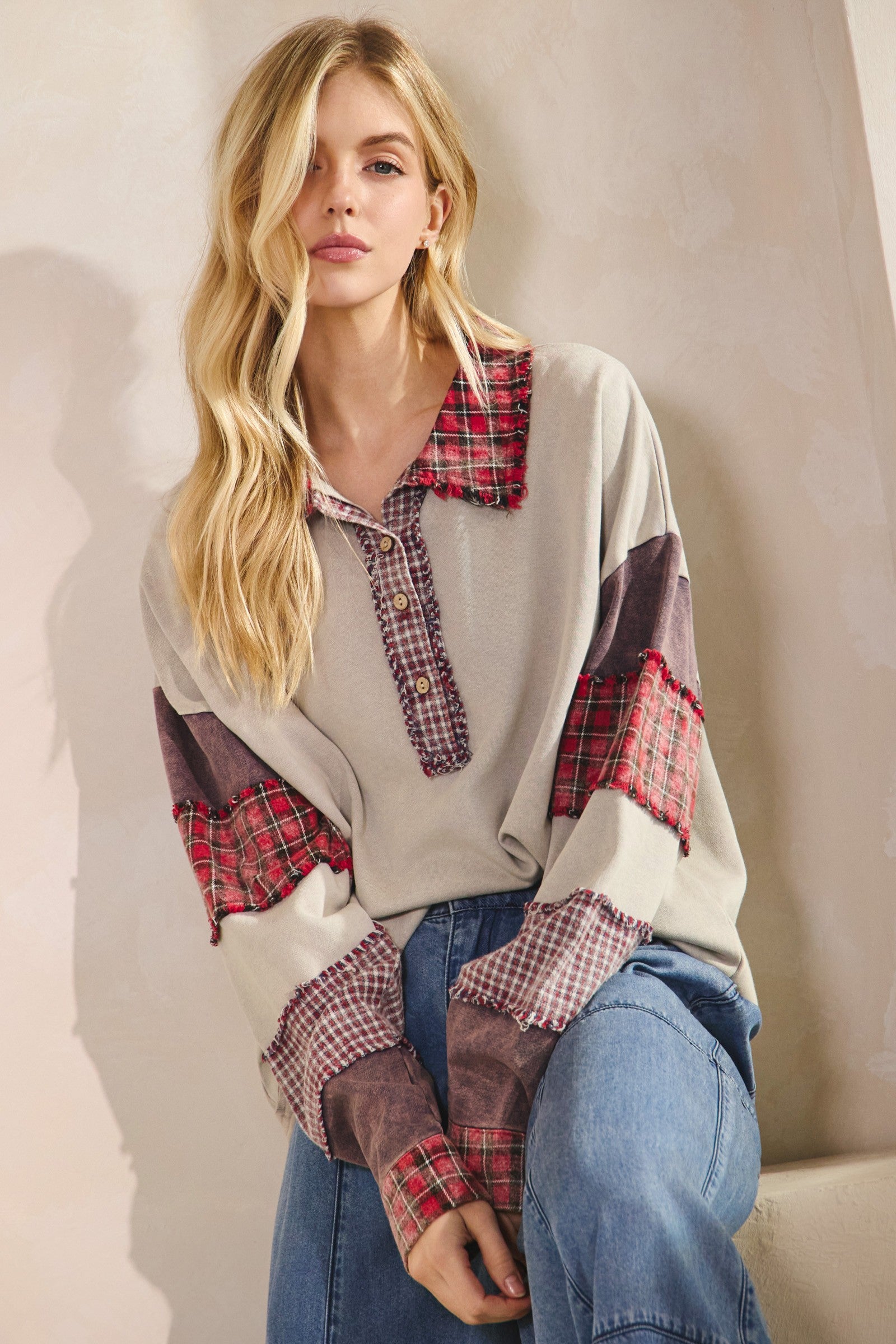 This long sleeve pullover features a brushed neutral body with bold contrast plaid and washed patchwork on the collar, placket, and sleeves. Finished with raw-edge detailing and a relaxed fit, it's a boutique piece with laid-back cabin-core charm.